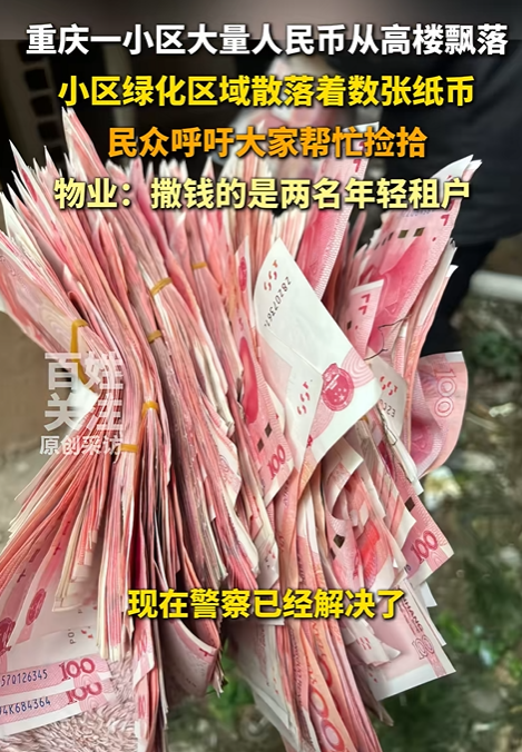 3月26日,有网友发视频称,重庆市九龙坡区一小区有人从高空向下撒钱,引发关注。视频显示,有大量纸币在空中飞下,有人捡到一大把百元钞票,还有人用桶装钱。